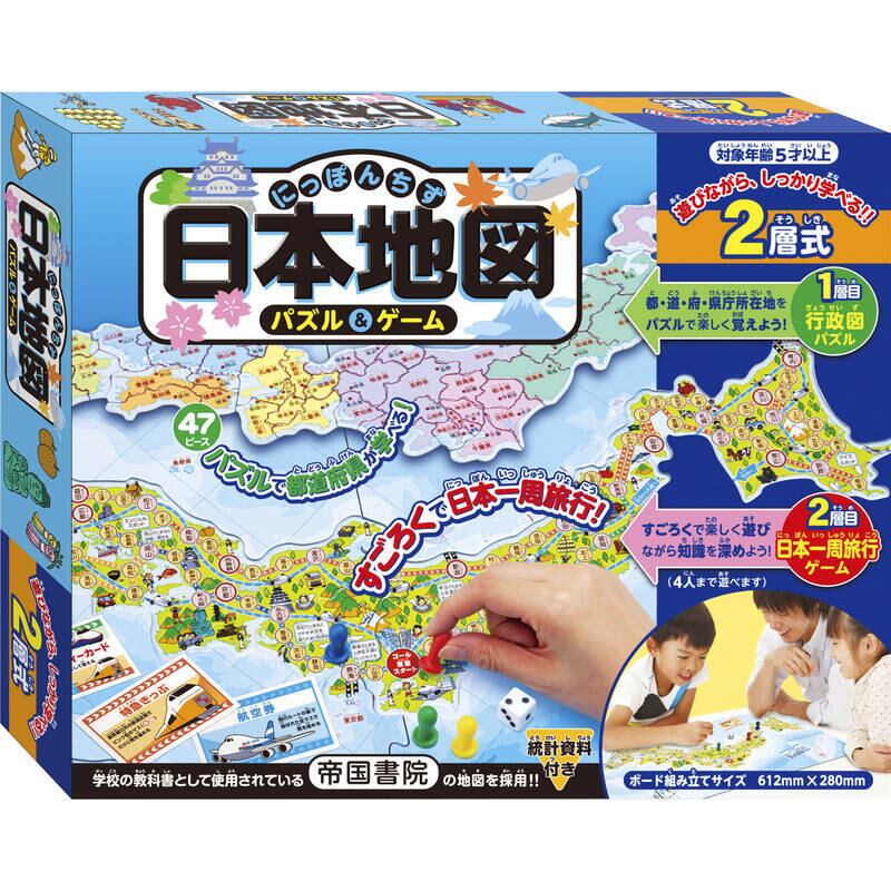 日本一周旅行ゲームとパズルがひとつになった遊びごたえ満点の日本地図セットです。帝国書院の地図帳より、都道府県別の国土や産業、人口などの統計資料がついて、情報が盛りだくさん。日本の周りの領域が一目でわかる地図も入って、日本の領域の広さを感じられます。
